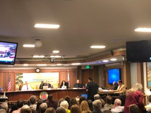 The council heard from a proponent of “rail with trail” and also a “trail only” advocate. The invited guests were Mark Mesti-Miller, a leading advocate for “rail with trail” and Bud Colligan, local philanthropist, activist, and a founding and leading member of the Santa Cruz Greenway initiative. The council chambers were packed; it was standing room only, and people were invited to sit in the overflow room next adjacent to the council chambers.